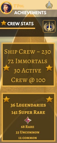 It’s a bit of juggling without enough crew spots, so grab them when db have specials on, have recently upgraded to 200 Crew spots. Have also had 4 shuttles for a long while. On another note, I picked Cmdr T’Pol as an Avatar mainly because she’s one of the few Vulcan female characters also, Jolene Blalock played the part very well.